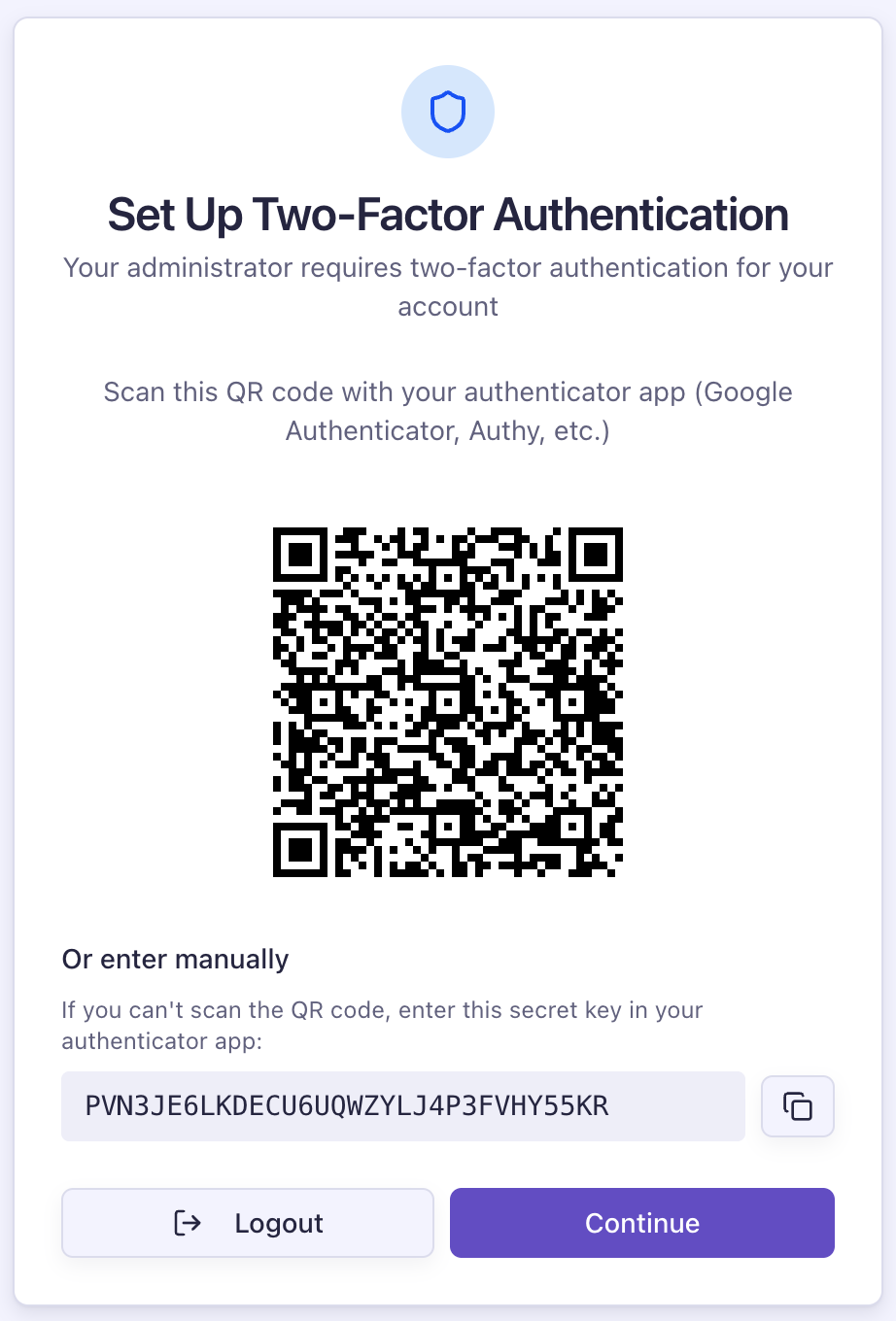 Scan the QR code with your authenticator app (Google Authenticator, Authy, 1Password, etc.) or copy the secret manually.